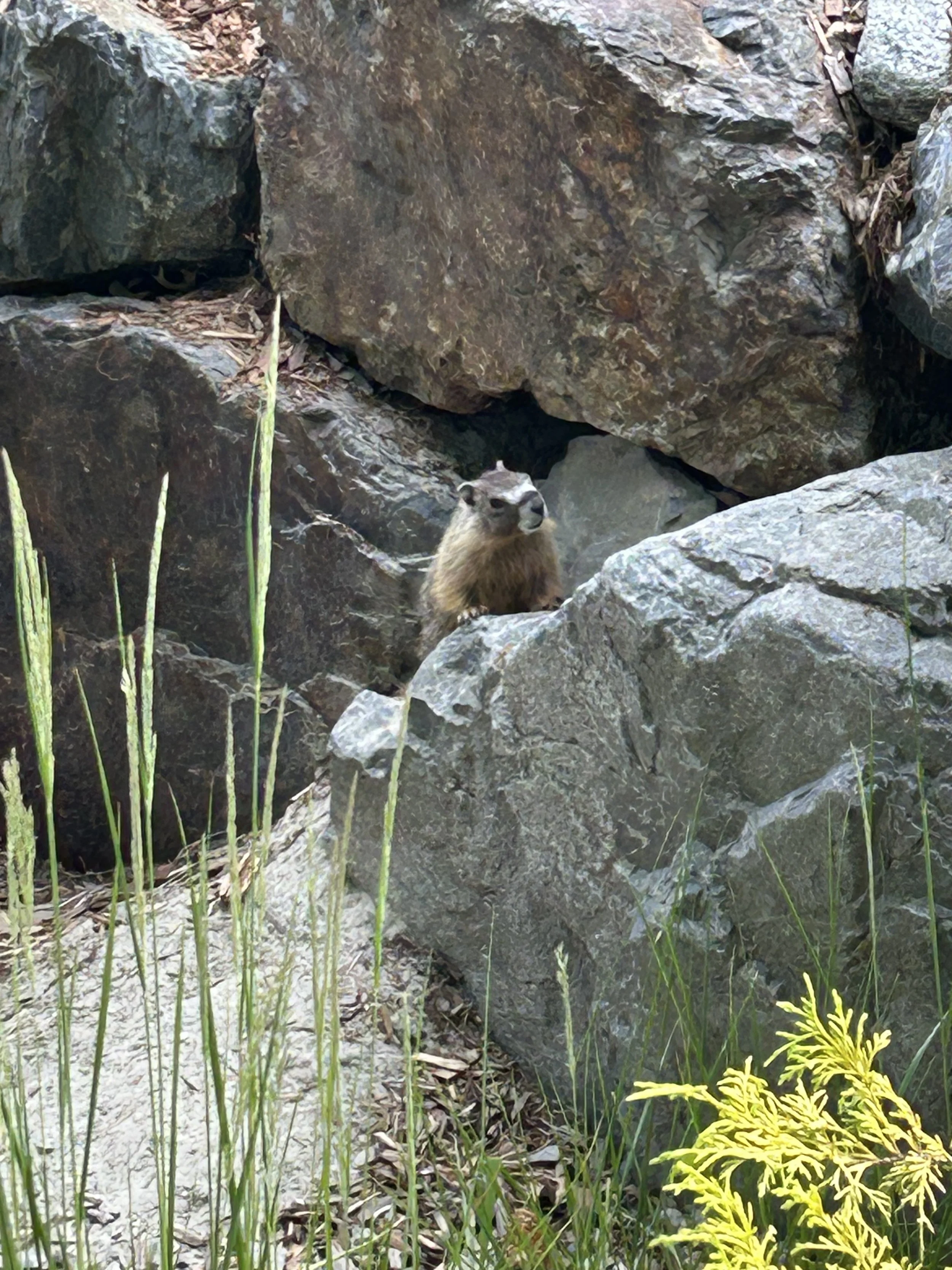 A garden with a gravel pathway, rocks, plants, and a bronze sculpture of a woman wearing a wide-brimmed hat, carrying a coil of rope.